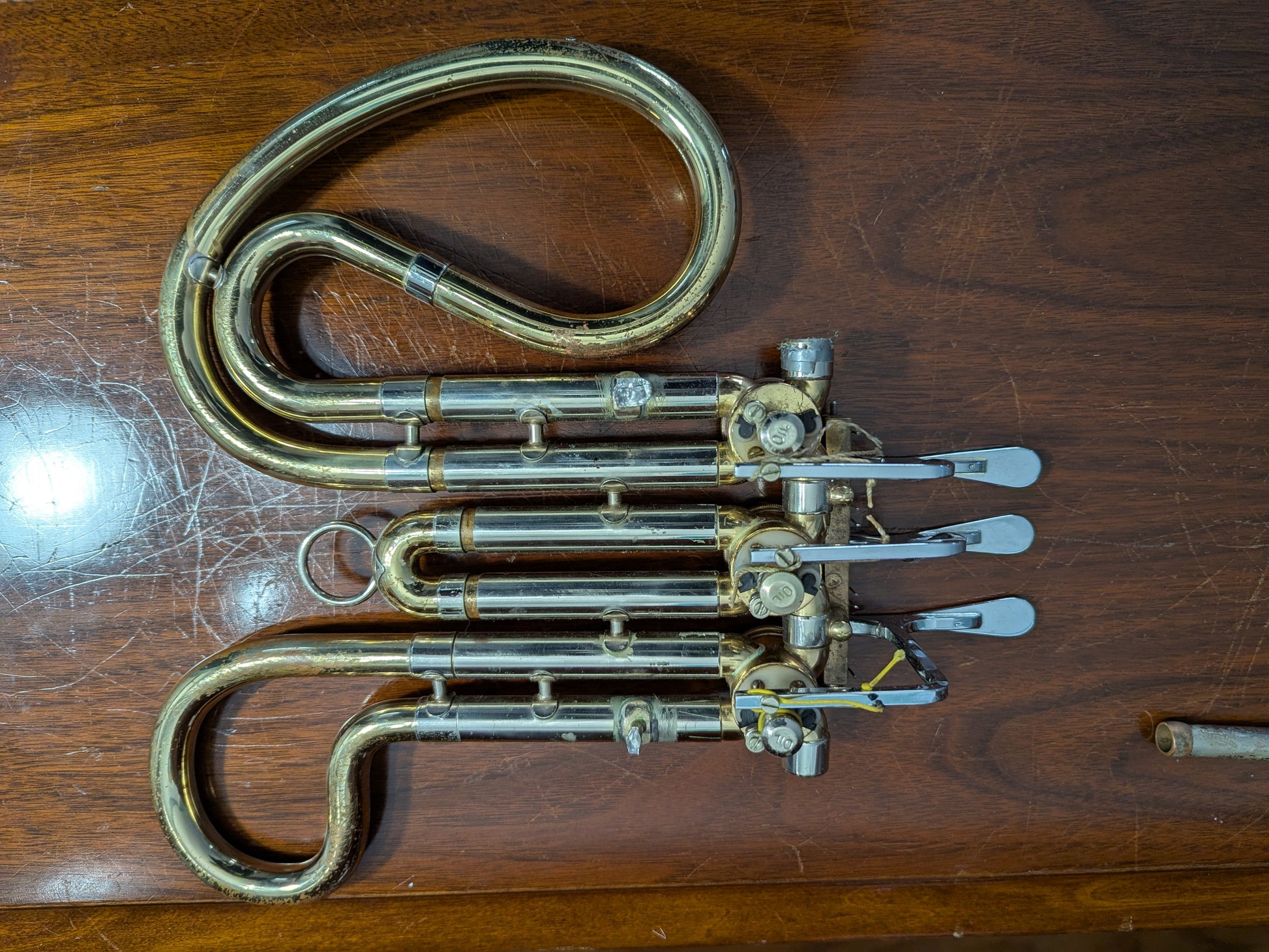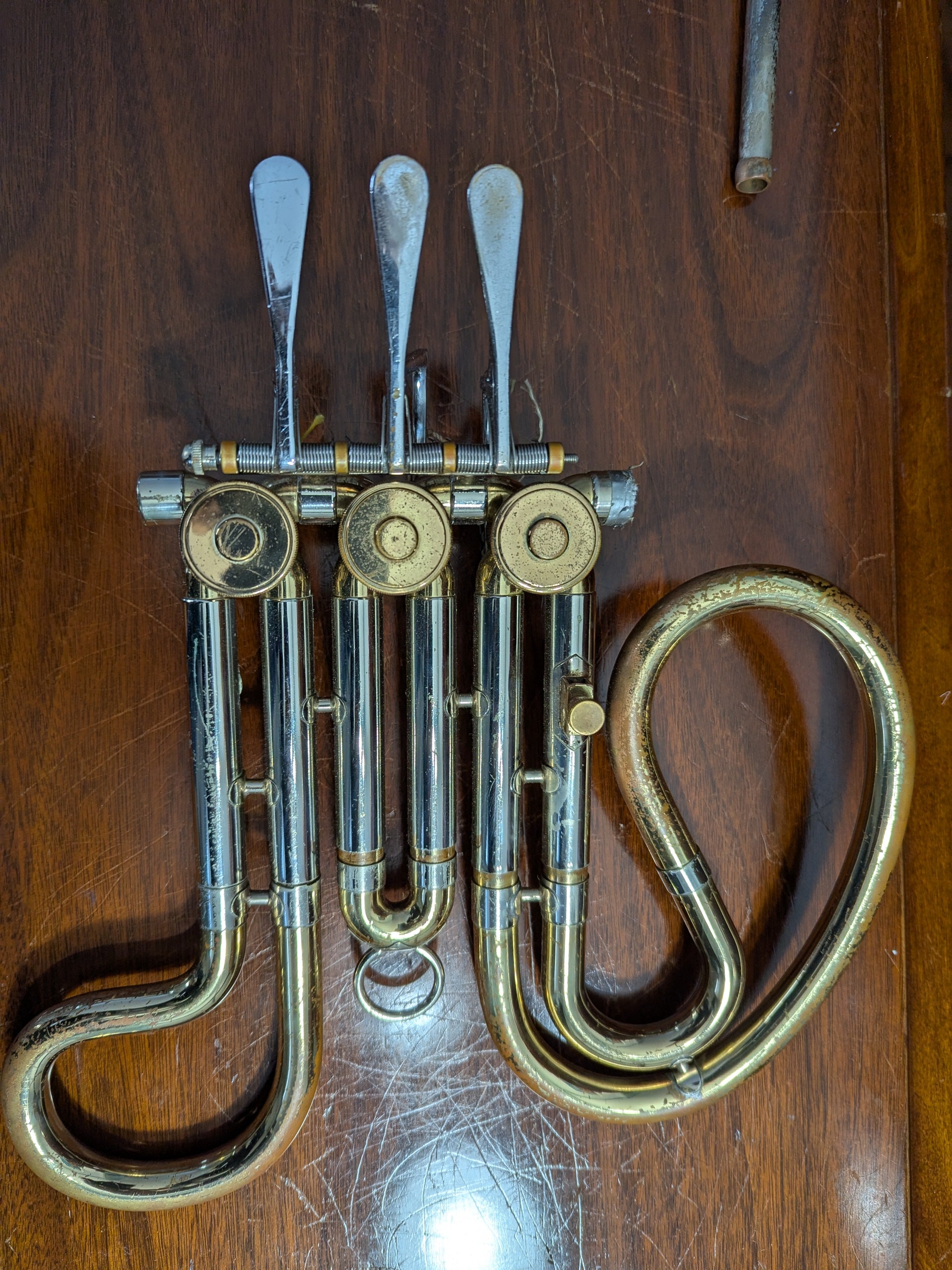 Here is a complete valve cluster with tuning slides to an Olds Ambassador horn. Except for the lacquer, the slides are in excellent shape, the valves very tight, and all the valve hardware (screws, rotor stops, keys, etc) are present. The serial number is 683799, dating this horn part from 1969.