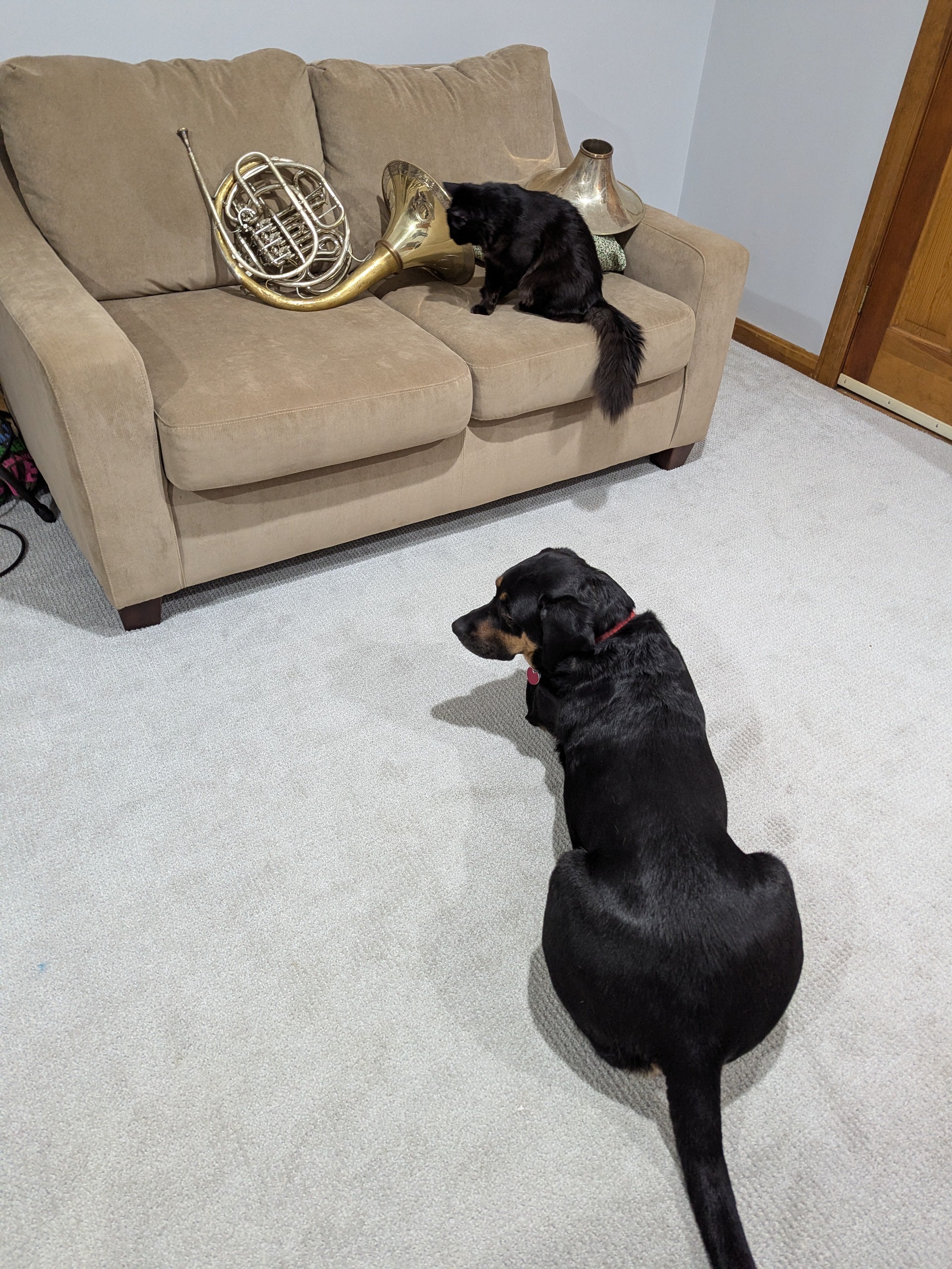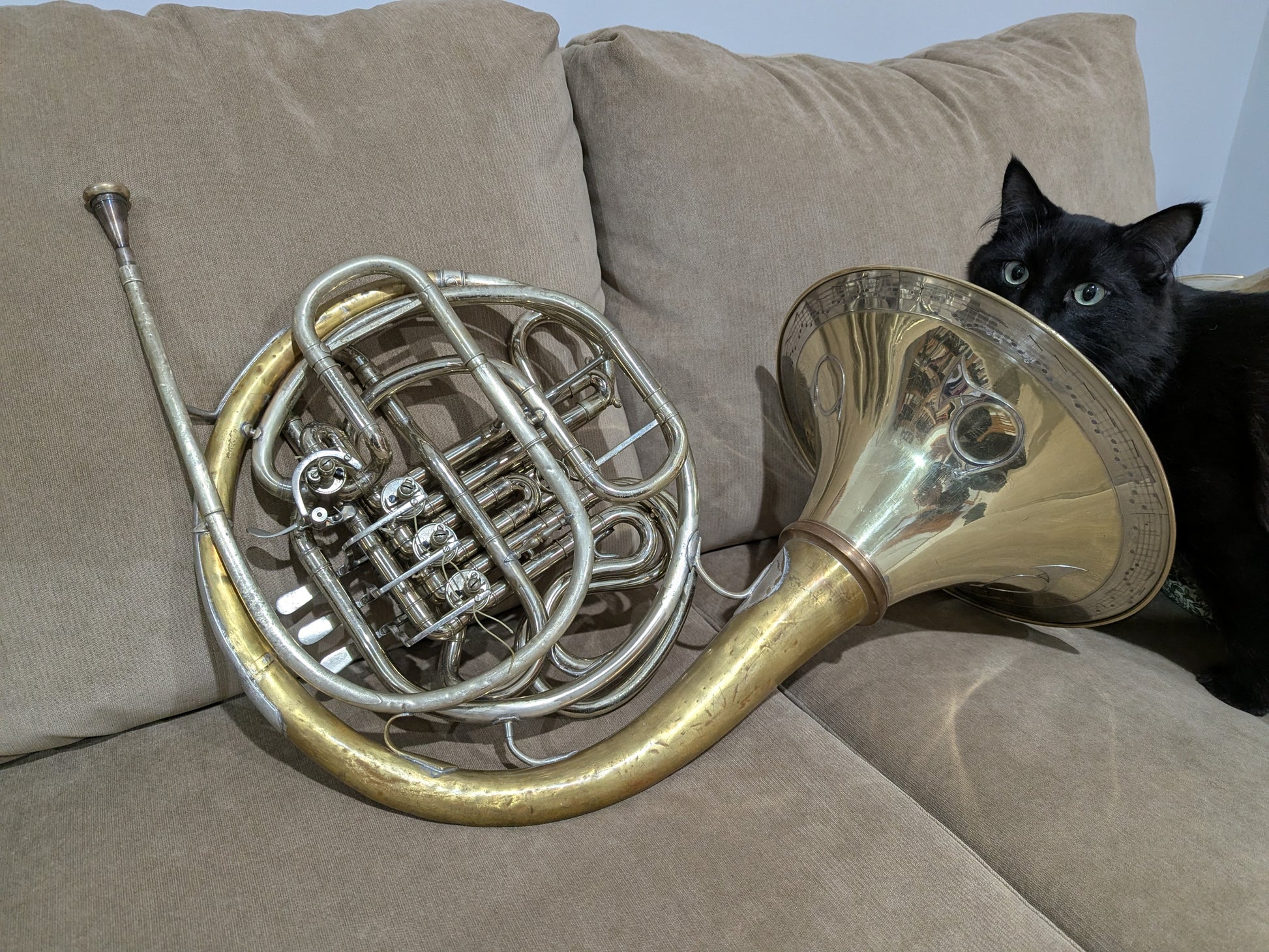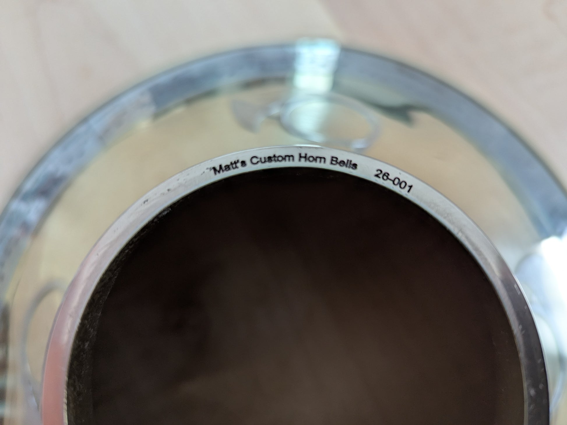 This customized bell is part of a unique duo–its garland is engraved in the second half of the Sigfried’s long call, picking up exactly where its partner left off. The bell itself is from a Conn 4D that likely belonged to a school district in Evansville Indiana since 1962, based on its 985,000s serial number. So after over 60 years of reliable service, the bell flare was straightened, delacquered, cleaned, and fitted with an Alexander compatible ring made of bronze for its good wear and low friction properties. In addition to the second half of Sigfried’s long call (engraved into four strips of nickel silver, and then soldered onto the bell rim in the style of a bell garland), four natural horn silhouettes were cut from nickel silver sheet-stock and then soldered around the mid-height of the bell flare. The natural horn silhouette is a very appropriate companion to the Sigfried’s Call garland.