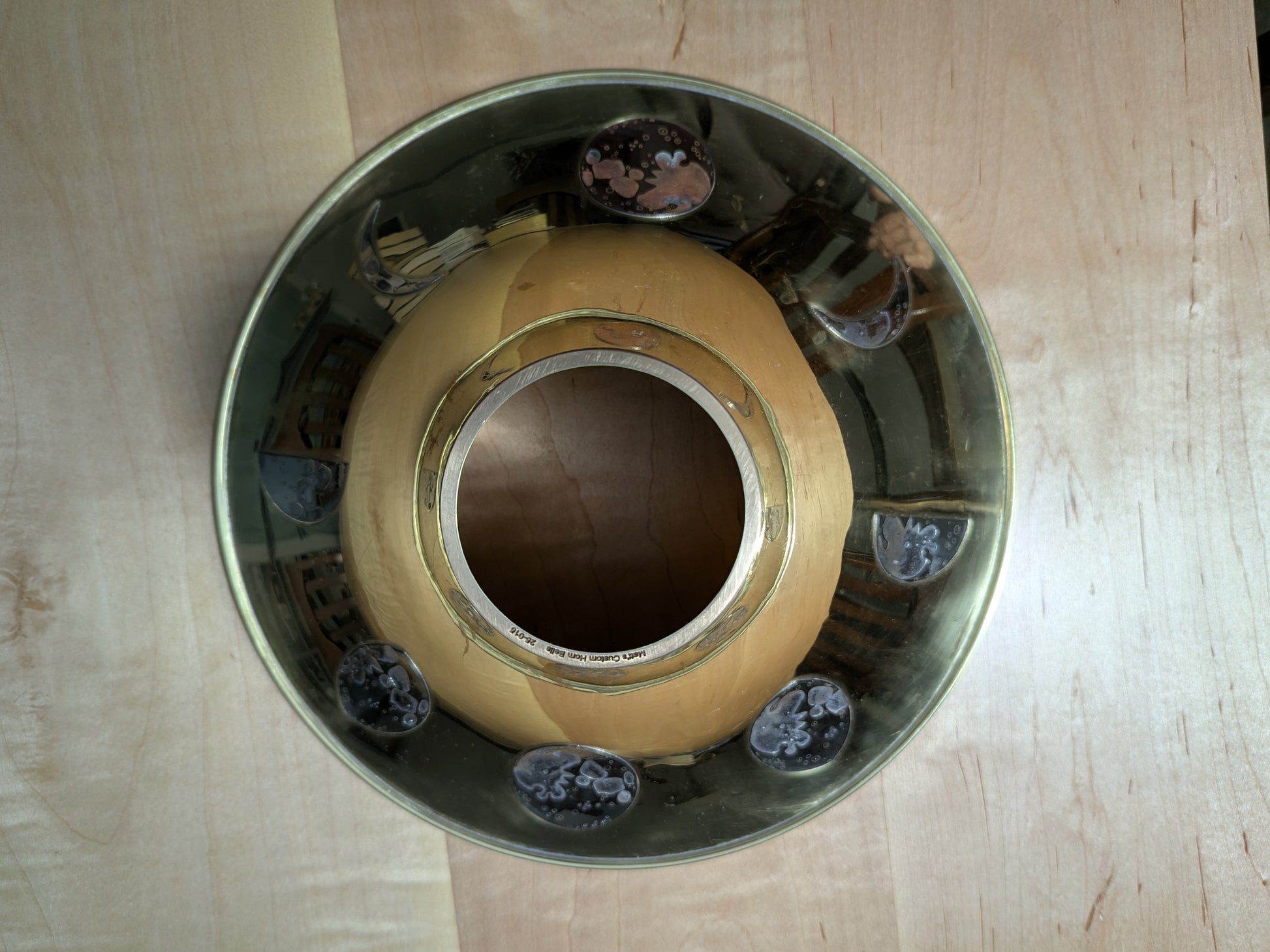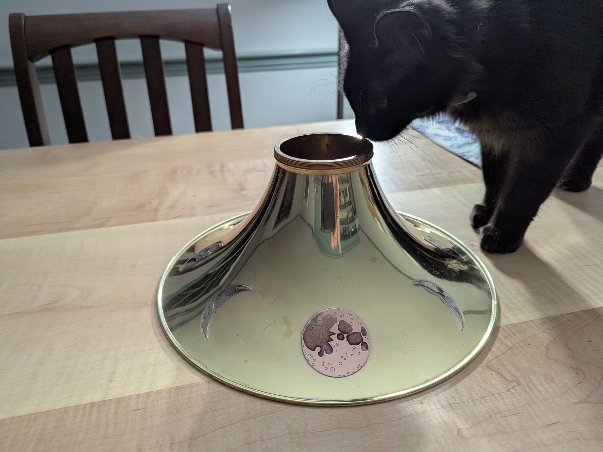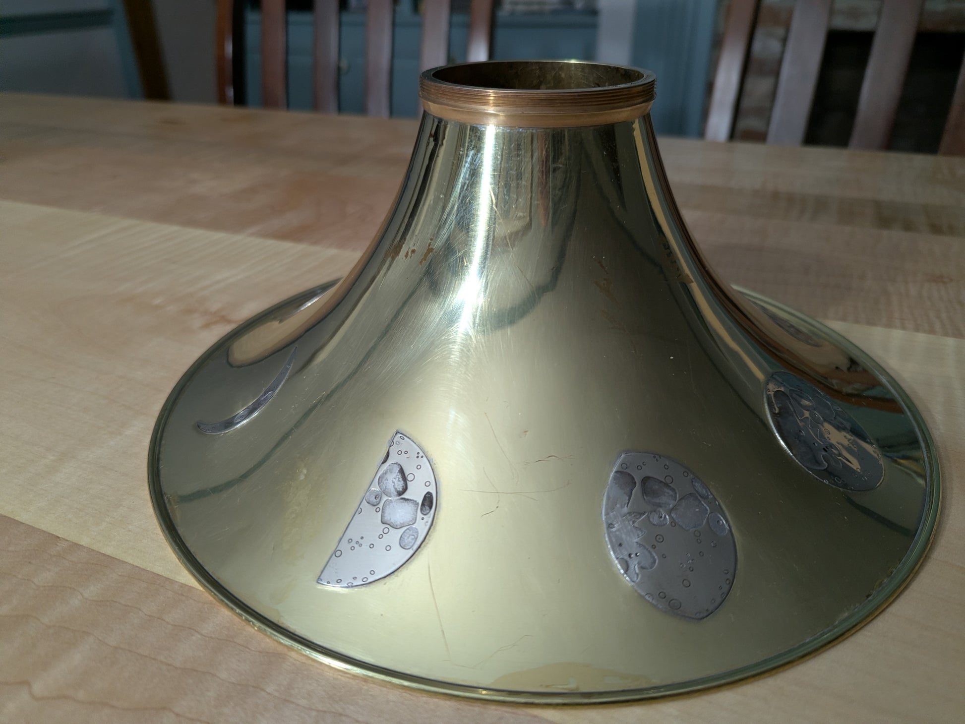 A yellow brass Yamaha YHR 567, of unknown serial number and vintage was the donor for this bell. It has been delacquered, cleaned, and fitted with an Alexander compatible ring made of bronze for its good wear and low friction properties. The phases of the moon are represented by eight moon silhouettes. Seven of the silhouettes are in nickel silver and depict the waxing and waning moon phases, and the eighth in copper, is the new moon (or could be an eclipsed moon). Each moon silhouette has been laser engraved to show some surface features including dark volcanic plains, called maria, and craters.